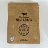 Our jerky is made with the tastiest ingredients on the island of Maui. Crafted in small batches, we strive to produce only the highest quality pipikaula, Hawaiian beef jerky. A staple of the 19th century paniolo (cowboys), the name pipikaula translates as “beef rope” and is as popular today as it was back on the open range. Maui Crisps are a mix of old and new traditional family recipes merged with lighter, crunchier chip unlike any other jerky. It’s an original! Ultra thin slices of high quality beef are marinated in the tastiest family sauces and dried to crispy perfection on the slopes of Haleakala. Enjoy!